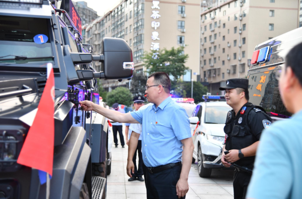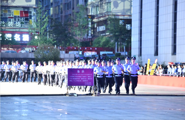 警灯闪烁,警容严整。在陶澍广场,9个方阵列队集结、精神抖擞、士气昂扬。晚上19:30分,在雄壮的国歌声中,誓师大会正式拉开序幕,安化县领导依次为基层实战单位发放新配备的警用交通装备钥匙。随后,副县长、县公安局党委书记、局长张强带领全体安保人员庄严宣誓。