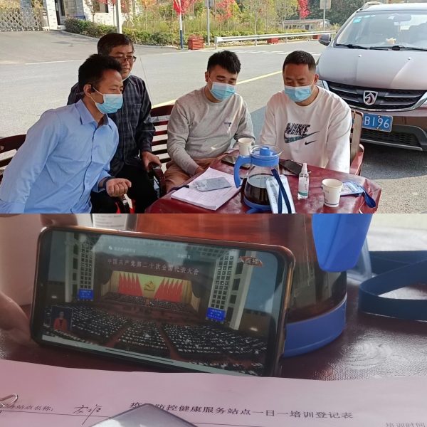 龙塘镇高速出口疫情防控服务站工作人员收看中国共产党第二十次全国代表大会开幕会