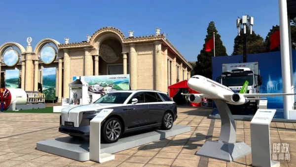 △“奋进新时代”主题成就展展出的C919大型客机模型等。(总台央视记者赵化拍摄)