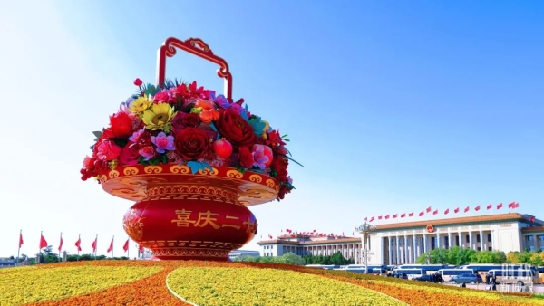 △北京长安街沿线的“伟大复兴”主题花坛。(总台央视记者魏帮军拍摄)