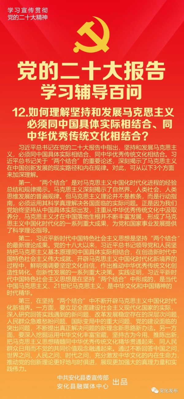 第三,在坚持“两个结合”中不断开辟马克思主义中国化时代化新境界。当前,世界百年未有之大变局加速演进,新征程上我们党肩负的使命任务艰巨繁重、面对的风险挑战复杂严峻,给我们党治国理政带来新的考验,也给理论创新提出新的更高要求。我们要认真贯彻党的二十大精神,更加自觉地坚持“两个结合”,不断推进实践基础上的理论创新。一方面,要立足全面建设社会主义现代化国家的实际,深入研究回答实践遇到的新问题、改革发展稳定存在的深层次问题、人民群众急难愁盼问题、国际变局中的重大问题、党的建设面临的突出问题,不断提出真正解决问题的新理念新思路新办法。另一方面,要深入挖掘运用中华文化丰富宝藏,坚持古为今用、推陈出新,把马克思主义思想精髓同中华优秀传统文化精华贯通起来、同人民群众日用而不觉的共同价值观念融通起来。通过不断回答中国之问、世界之问、人民之问、时代之问,充分激发中华文化的内在生命力,推动党的创新理论更好地与时俱进,展现更加强大的真理力量和实践伟力。