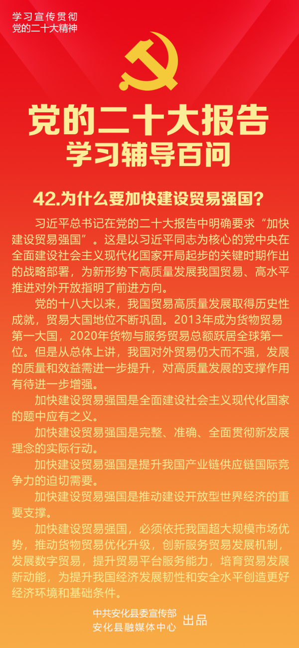 习近平总书记在党的二十大报告中明确要求“加快建设贸易强国”。这是以习近平同志为核心的党中央在全面建设社会主义现代化国家开局起步的关键时期作出的战略部署,为新形势下高质量发展我国贸易、高水平推进对外开放指明了前进方向。