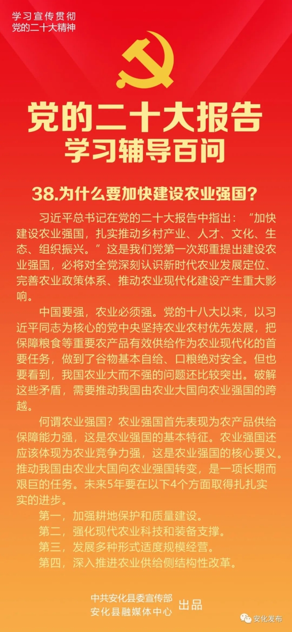 习近平总书记在党的二十大报告中指出:“加快建设农业强国,扎实推动乡村产业、人才、文化、生态、组织振兴。”这是我们党第一次郑重提出建设农业强国,必将对全党深刻认识新时代农业发展定位、完善农业政策体系、推动农业现代化建设产生重大影响。