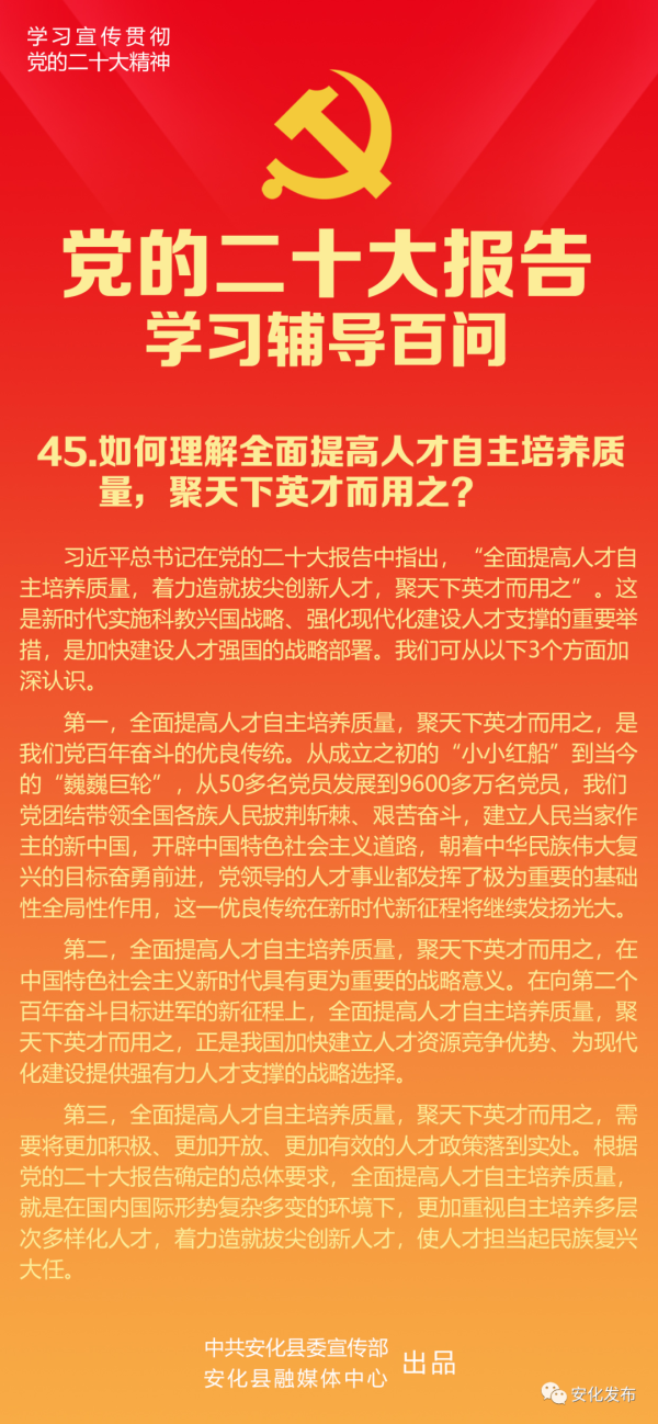 第三,全面提高人才自主培养质量,聚天下英才而用之,需要将更加积极、更加开放、更加有效的人才政策落到实处。习近平总书记明确指出:“中国是一个大国,对人才数量、质量、结构的需求是全方位的,满足这样庞大的人才需求必须主要依靠自己培养,提高人才供给自主可控能力。”根据党的二十大报告确定的总体要求,全面提高人才自主培养质量,就是在国内国际形势复杂多变的环境下,更加重视自主培养多层次多样化人才,着力造就拔尖创新人才,使人才担当起民族复兴大任。聚天下英才而用之,就是立足国内国际两个大局,加快建设世界重要人才中心和创新高地,促进人才区域合理布局和协调发展,以海纳百川的宽阔胸襟引进急需紧缺人才,加强人才国际交流,用好用活各类人才。全面提高人才自主培养质量,聚天下英才而用之,还要继续坚持尊重劳动、尊重知识、尊重人才、尊重创造的方针,深化人才发展体制机制改革,真心爱才、悉心育才、倾心引才、精心用才,求贤若渴,不拘一格,把各方面优秀人才集聚到党和人民事业中来,引导广大人才爱党报国、敬业奉献、服务人民,特别是要健全让青年人才安身、安心、安业的保障制度机制,更好激发各类人才的创新活力和创造潜力。