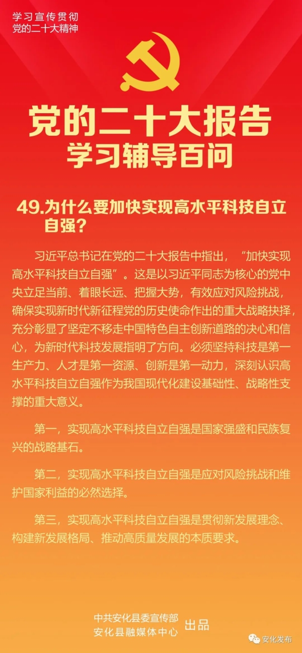 习近平总书记在党的二十大报告中指出,“加快实现高水平科技自立自强”。这是以习近平同志为核心的党中央立足当前、着眼长远、把握大势,有效应对风险挑战,确保实现新时代新征程党的历史使命作出的重大战略抉择,充分彰显了坚定不移走中国特色自主创新道路的决心和信心,为新时代科技发展指明了方向。必须坚持科技是第一生产力、人才是第一资源、创新是第一动力,深刻认识高水平科技自立自强作为我国现代化建设基础性、战略性支撑的重大意义。