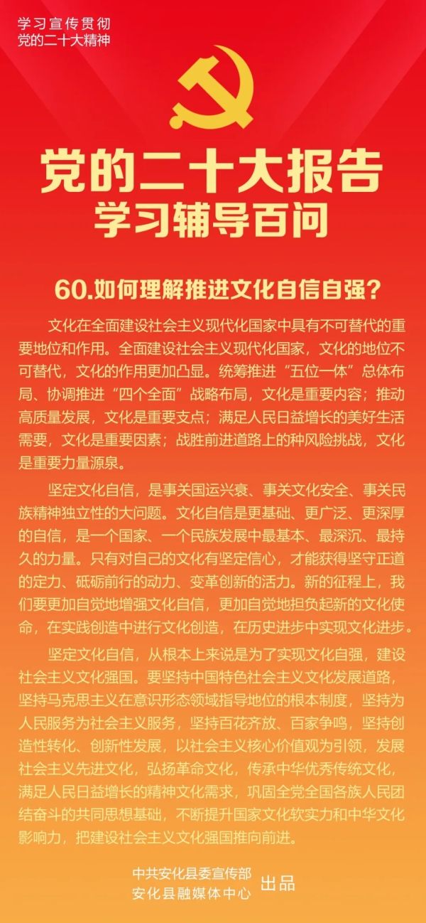 习近平总书记在党的二十大报告中指出:“推进文化自信自强,铸就社会主义文化新辉煌。”这是着眼全面建设社会主义现代化国家、全面推进中华民族伟大复兴提出的重大论断和重要任务,体现了我们党高度的文化自觉,彰显了我们党鲜明的文化立场,进一步凸显了文化建设在中国特色社会主义事业全局中的重要地位,把我们党对文化作用和文化发展规律的认识提升到一个新的境界。