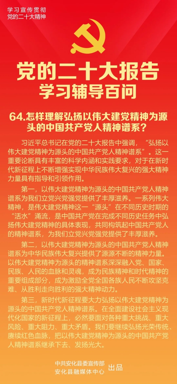 第二,以伟大建党精神为源头的中国共产党人精神谱系为中华民族伟大复兴提供了源源不断的精神力量。以伟大建党精神为源头的精神谱系是中国共产党人独特的精神标识,是中国共产党带领人民战胜各种艰难险阻、取得一个又一个伟大胜利的精神丰碑。它以“坚持真理、坚守理想”的内涵,体现了中国共产党人树立起坚定的理想信念,也标志着中华民族精神支柱的重新塑造,使中国人在精神上由被动转入主动。它以“践行初心、担当使命”、“对党忠诚、不负人民”的精神,空前激发了中华民族的爱国主义精神。它以“不怕牺牲、英勇斗争”的精神,使我们民族的血性与活力被唤醒并迸发出来,古老的中华民族展现出敢于革命、敢于斗争、自立自强、朝气蓬勃的新面貌新形象。以伟大建党精神为源头的精神谱系深深融入党、国家、民族、人民的血脉和灵魂,成为民族精神和时代精神的重要组成部分,成为激励全党全国各族人民不断攻坚克难、从胜利走向胜利的强大精神动力。