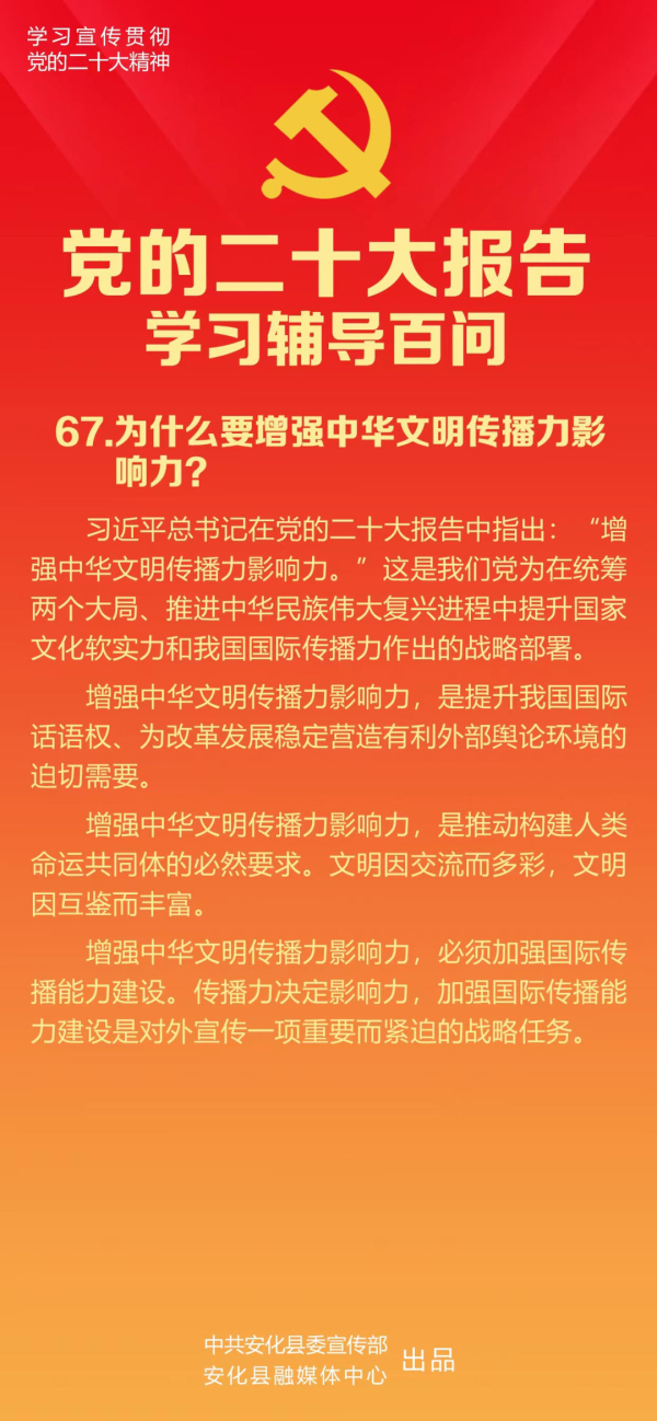 习近平总书记在党的二十大报告中指出:“增强中华文明传播力影响力。”这是我们党为在统筹两个大局、推进中华民族伟大复兴进程中提升国家文化软实力和我国国际传播力作出的战略部署。