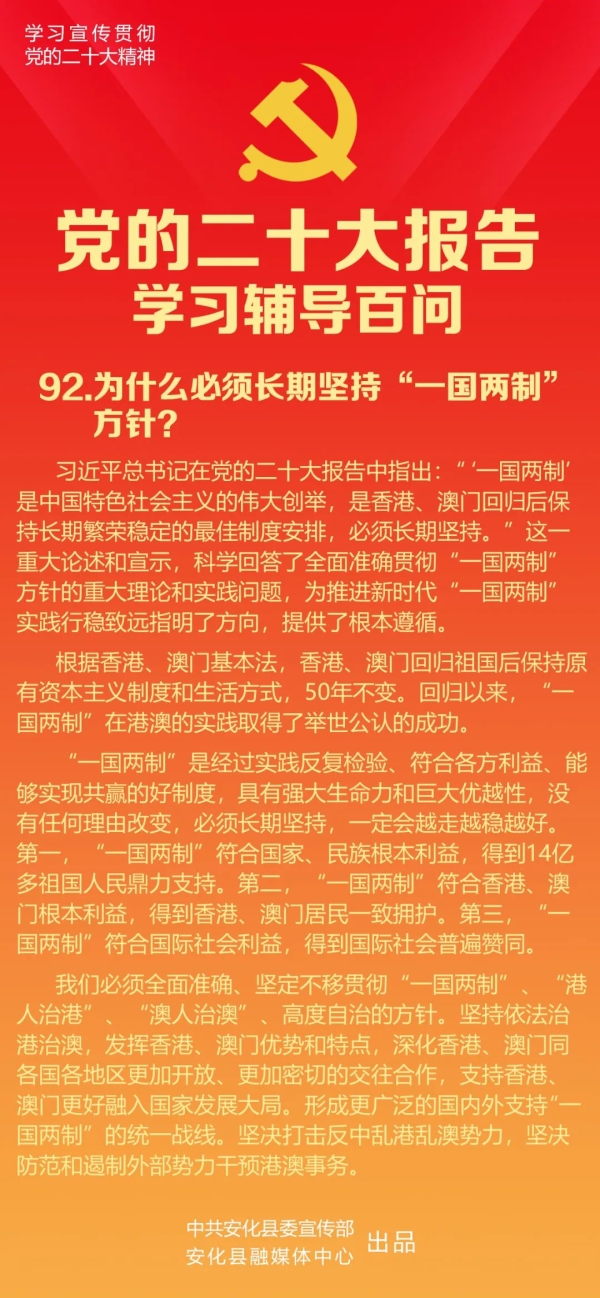 根据香港、澳门基本法,香港、澳门回归祖国后保持原有资本主义制度和生活方式,50年不变。回归以来,“一国两制”在港澳的实践取得了举世公认的成功。一个时期,受各种内外复杂因素的影响,反中乱港势力猖獗,肆意挑战“一国两制”原则底线,2019年“修例风波”更使香港一度出现最严峻的局面。两年多来,中央采取一系列标本兼治重大举措,推动香港局势实现由乱到治的重大转折。香港社会高度关注会不会继续实行“一国两制”方针、香港前途命运如何。国际社会对此也十分关心。继2022年7月1日在庆祝香港回归祖国25周年大会上发表重要讲话之后,习近平总书记在党的二十大报告中郑重向国内外宣示“一国两制”方针必须长期坚持,回答了事关香港、澳门长期繁荣稳定和长治久安的根本问题,具有重大深远的意义。这一重大宣示,锚定了“一国两制”实践的历史坐标,指明了“一国两制”实践的发展方向,筑牢了“一国两制”实践的坚实根基,极大增强了包括港澳同胞在内的全国人民和国际社会对“一国两制”事业的信心和决心。
