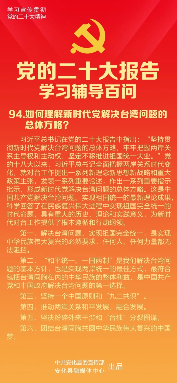习近平总书记在党的二十大报告中指出:“坚持贯彻新时代党解决台湾问题的总体方略,牢牢把握两岸关系主导权和主动权,坚定不移推进祖国统一大业。”党的十八大以来,习近平总书记全面把握两岸关系时代变化,就对台工作提出一系列新理念新思想新战略和重大政策主张,发表一系列重要论述,作出一系列重要指示批示,形成新时代党解决台湾问题的总体方略。这是中国共产党解决台湾问题、实现祖国统一的最新理论成果,科学回答了在民族复兴伟大进程中实现祖国完全统一的时代命题,具有重大的历史、理论和实践意义,为新时代对台工作提供了根本遵循和行动纲领。