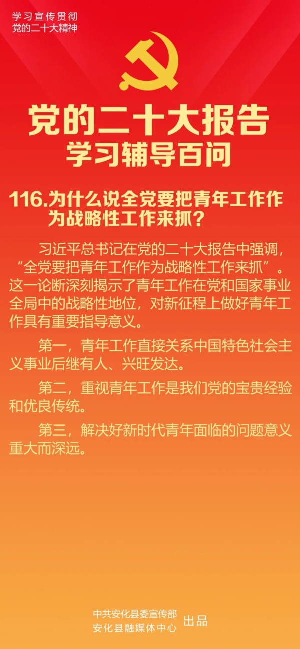 习近平总书记在党的二十大报告中强调,“全党要把青年工作作为战略性工作来抓”。这一论断深刻揭示了青年工作在党和国家事业全局中的战略性地位,对新征程上做好青年工作具有重要指导意义。